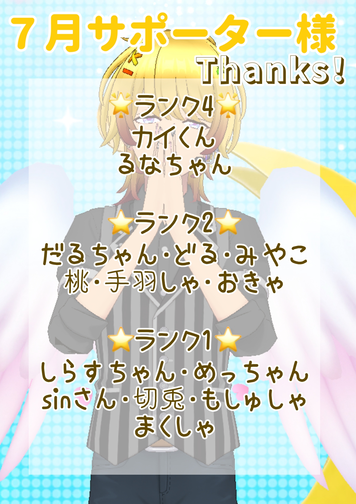 翔 @wwx_show 2025年8月5日(火) 11:16 205日前 お知らせ ⭐️2025年7月サポーター様⭐️ ⭐️2025年7月サポーター様⭐️ 7月も沢山の応援ありがとうございました! そして、お誕生日のお祝いを盛大にしていただき、ありがとうございました! 最高の思い出になりました☺️ #サポーター