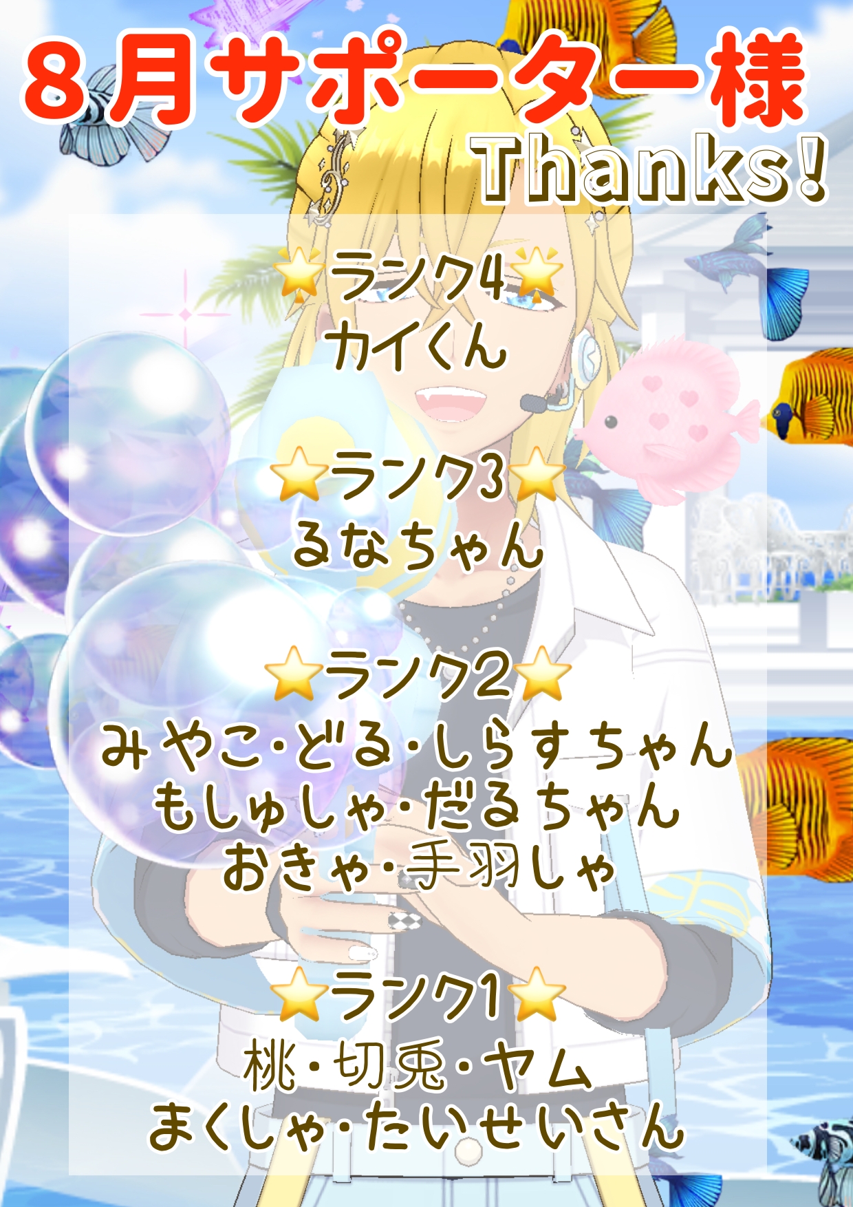 翔 @wwx_show 2025年9月2日(火) 07:29 177日前 お知らせ ⭐️8月サポーター様⭐️ ⭐️8月サポーター様⭐️ 8月は色んな形の配信をしました! WWXもしたし、台詞枠もしたし、全日本どろんこジャリジャリ祭りでのコラボもしたし。 沢山の応援ありがとうございました! 楽しい時間をいつもありがとう🙏✨ #サポーター